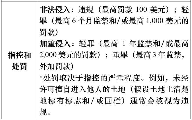 大多数人都听说过“侵入”一词并了解其基本含义——未经他人许可进入他人财产。但从法律上讲,还必须有某种程度的意图。简单地闯入某人的财产本身并不是犯罪或民事错误,但翻过篱笆或无视“禁止擅自进入”的标志确实足以表明意图。刑事侵入指控通常涉及其他不法行为(或实施这些行为的意图),例如入室盗窃、破坏公物或侵犯隐私。 重要的是要了解侵入既是犯罪又是民事错误。例如,如果您和您的朋友在明确标记为私人或其他禁区的财产上生火,您可能会在加利福尼亚州因非法侵入罪被捕。此外,无论是否有犯罪行为,业主都可以向侵入者提出索赔,以收取损害赔偿金。 加州非法侵入法一览 加利福尼亚州的刑法列出了 20 多个构成非法侵入指控的不同例子,例如“在不对公众开放的区域故意滑雪”,因此无法在此一一列举。但下面列出了加利福尼亚州非法侵入的基本情况。 注意:州法律随时可能更改。在我们努力提供最新信息的同时,请咨询刑事辩护律师或进行您自己的法律研究以验证您正在研究的州法律。有关加州法律对非法侵入的完整定义,请参阅完整法规。 < 律师网 > 提醒: 非法侵入属于严重的刑事犯罪,会被留下有罪的记录,如果还不是美国公民的人留下记录之后会无法入公民及绿卡申请延期。如果有人入侵到你的领地,侵犯了你的权利,你可以马上报警,让警察写下出警记录,一周后到警察局去拿警察报告。如果紧急的话,也可以申请紧急禁止令。 |